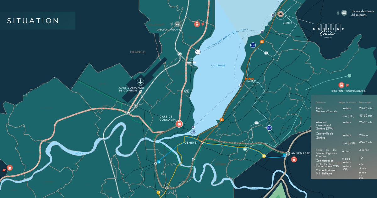 Anières se distingue aussi par son esprit durable et contemporain : la commune encourage la mobilité douce et l’habitat respectueux de l’environnement. Reliée efficacement par les lignes de bus TPG (E et 38) et les axes principaux, elle offre une accessibilité fluide vers le centre-ville, l’aéroport ou la campagne genevoise.